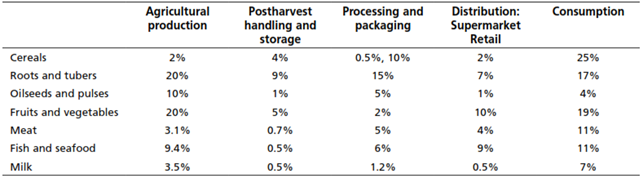 L’ultimo anello della filiera è rappresentato dallo smaltimento dei prodotti espresso come “kg di prodotto smaltito”. L’impatto relativo alla perdita di cibo è stato sommato all’interno degli impatti dei prodotti e la percentuale di prodotto perso è stata definita in accordo con lo studio FAO “Global Food Losses and Food Waste e Extent, Causes and Prevention” come segue e considerando gli impatti relativi alla prima fase di produzione agricola già incorporati nei profili ambientali di prodotto: